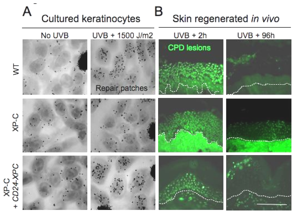 - Arnaudeau-Begard, C.; Brellier, F.; Chevallier-Lagente, O.; Hoeijmakers, J.; Bernerd, F.; Sarasin, A.; Magnaldo, T. Genetic correction of DNA repair-deficient/cancer-prone xeroderma pigmentosum group c keratinocytes. Hum. Gene Ther 2003, 14, 983–996. [Google Scholar]