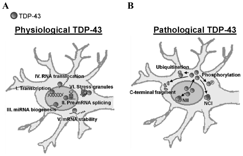 Expression of TDP-43 in physiological and pathological conditions. The upper panel shows the physiological functions of TDP-43, including transcription, pre-mRNA splicing, mRNA biogenesis, stress granules formation and mRNA stability. The lower panel shows the pathological expressions of TDP-43, which is predominantly sequestered in the cytoplasm, different from TDP-43 proteinopathy. (A) The roles of TDP-43 in the physiological neuron; (B) The morphologies of TDP-43 in the pathological neuron.