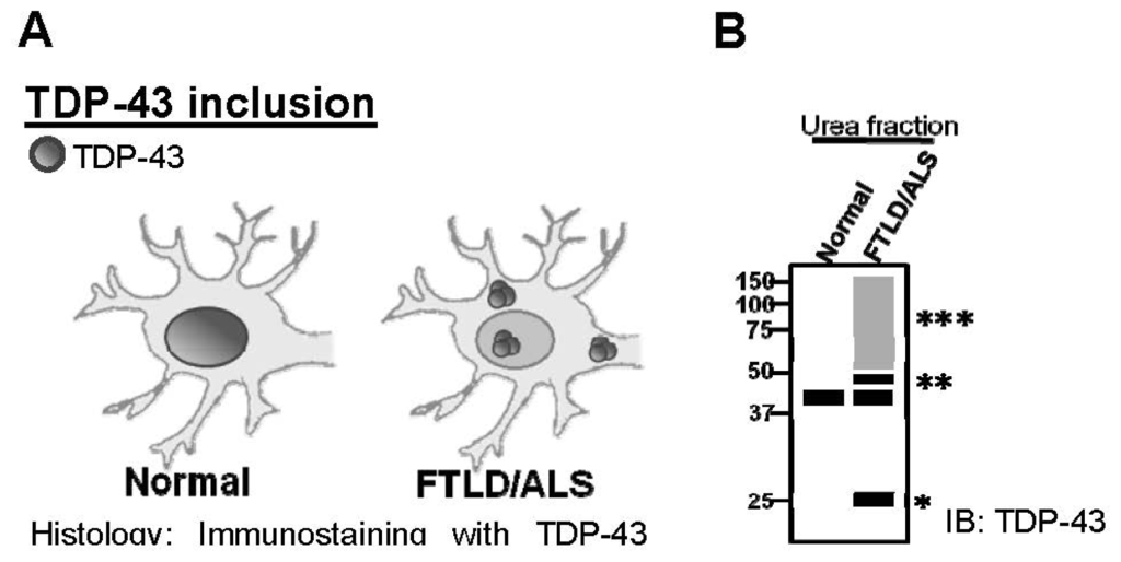 With the advent of medical and technical advances, people may now live longer. Age-related diseases also gain more attention, especially neurodegenerative diseases. A common feature of such neurodegenerative diseases is the misfolding and aggregated disease protein in the central nervous system of patients. A typical example is the transactive response DNA-binding protein (TDP-43), which plays a pivotal role in the pathogenesis of frontotemporal lobar degeneration (FTLD) and amyotrophic lateral sclerosis (ALS). A common neurodegenerative disease, FTLD accounts for 5%–24% of early-onset dementia. Patients are characterized by marked atrophy in the frontal and temporal lobes of the brain and have behavior and language dysfunctions [1,2]. Some of FTLD patients also have abnormal motor symptoms similar to motor neuron diseases (MND).