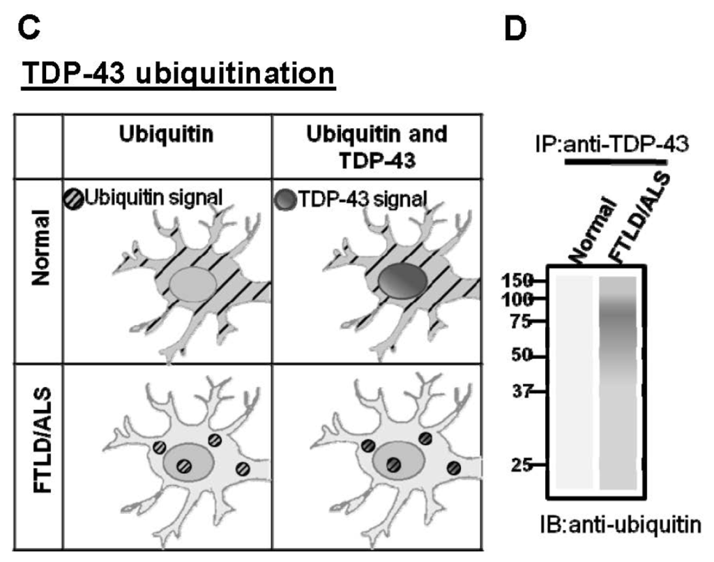Experiments to examine TDP-43 proteinopathy in diseases animal models. (A) In histological staining with TDP-43 antibody, physiological TDP-43 is predominantly expressed in the nucleus of neurons, whereas in FTLD/ALS patients, TDP-43 would form inclusion bodies in the cytoplasm (NCI) or nuclear (NII); (B) Truncated TDP-43, phosphorylated TDP-43 and ubiquitinated TDP-43 is expressed in TDP-43 inclusions; (C) Through co-immunostaining with TDP-43 and ubiquitin antibody, signals of ubiquitin and TDP-43 would be detected in different subcellular localizations. However in FTLD/ALS, TDP-43 would co-localize with ubiquitin in the nucleus to form NII or in the cytoplasm to form NCI; (D) TDP-43 is tightly associated with ubiquitin in the CNS of FTLD/ALS by co-immunoprecipitation. * truncated TDP-43 (25 kDa); ** phosphorylated TDP-43; *** high molecular TDP-43 (ubiquitinated TDP-43).