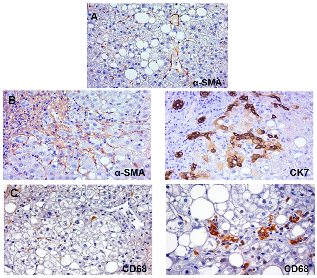 (A) Immunohistochemistry for α-smooth muscle actin (α-SMA) in non-alcoholic fatty liver disease (NAFLD). In NAFLD, pericentral fibrogenesis is due to activation of hepatic stellate cells (HSCs) which acquire α-SMA positivity. Original Magnification: 20×; (B) Immunohistochemistry for α-smooth muscle actin (α-SMA) and Cytokeratin (CK)-7 in NAFLD. In advanced stages of NAFLD, periportal fibrogenesis is present. In this case, α-SMA positive myofibroblasts surround CK7+ reactive ductules at the periphery of portal spaces. Original Magnification: 20×; (C) Immunohistochemistry for CD68 in NAFLD. CD68 is specifically expressed by Kupffer cells and macrophages which are distributed throughout entire liver lobule both at pericentral and periportal position. Macrophage foam cells are clearly recognized in left image. Original Magnification: 20× (right) and 40× (left).