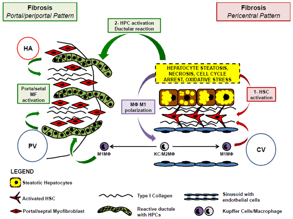 Cartoon indicating possible cellular cross-talks among hepatic stellate cells (HSCs), hepatic progenitor cells (HPCs) and Kupffer cells/macrophage (KC/MΦ) in NAFLD progression. Two distinct fibrogenic pathways are present in NAFLD. Pericentral fibrogenesis is due to activation of HSCs by damaged hepatocytes. On the other hand, hepatocyte damaging could stimulate HPC proliferation, thus resulting in the appearance of ductular reaction (DR); in turn, DR activates portal myofibroblasts (MF) which are responsible of periportal fibrogenesis. Finally, KC/MΦ polarization toward M1 phenotype could be involved in both pathways since M1-MΦs are able to stimulate HSCs and HPCs. PV = portal vein; CV = central vein; HA = hepatic artery.