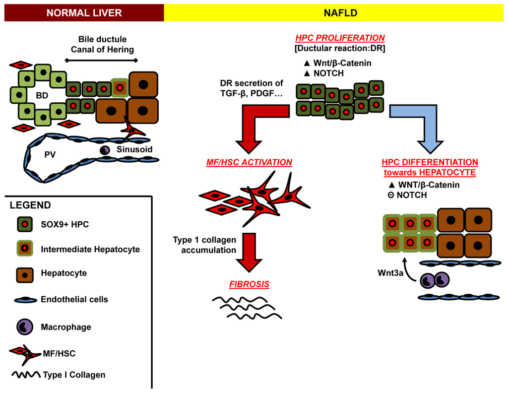 Studies of NAFLD, both in rodent models and human beings, have confirmed that HPCs are activated when oxidative stress inhibits the regenerative capacity of more mature hepatocytes supporting the concept that HPC expansion is a component of the liver’s adaptive response to oxidative stress [62,63]. Recent evidence suggested that resident stem/progenitor cell pool participates in the repair of liver damage either through the replacement of dead cells or by driving fundamental repair processes, including fibrosis and angiogenesis [38,64,65].