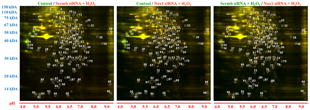 Representative 2D gel images. Vascular smooth muscle cells (VSMC) incubated with vehicle (control) or transfected with Scrmb or Nox1 siRNA and treated with H2O2 (50 μM, 3 h) were lysed and fluorescently labeled with Cy3, Cy2, or Cy5, respectively and run on a 2D gel (n = 1). Images show the comparisons of two fluorescent channels at a time (assigned green and red pseudocolors) as presented in Table 1. Vertical scale indicates the molecular weight ladder; lower horizontal scale denotes pH gradient. The 96 gel spots selected by DeCyder are annotated by white numbers.