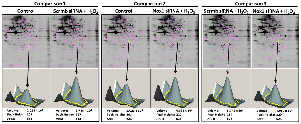 - Comparisons 1 & 2: (“Scrmb siRNA + H2O2”/“control”) − (“Nox1 siRNA + H2O2”/“control”) ≥ 0.3-fold or ≤ −0.3-fold