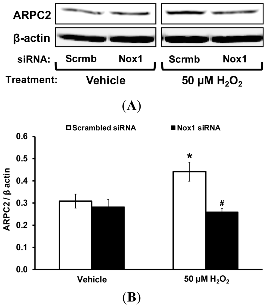To verify the reliability of proteomic analysis, ARPC2 protein expression was analyzed by Western blot. VSMC were transfected with Nox1 or Scrmb siRNA and treated with vehicle or 50 μM H2O2 for 3 h. Nox1 protein expression was previously determined to be suppressed by ~70% using Nox1 siRNA without affecting Nox4 expression [10] (Nox2 and Nox5 are not expressed in rat aortic VSMC [7,10]). As shown in Figure 3, treatment of VSMC with H2O2 significantly increased ARPC2 expression. Gene silencing of Nox1 using siRNA significantly decreased ARPC2 expression in H2O2-treated VSMC.