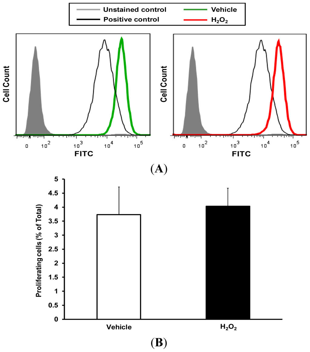 To investigate whether increased cellular proliferation in response to H2O2 treatment contributes to wound closure, VSMC proliferation was investigated using the carboxyfluorescein diacetate succinimidyl ester (CFSE) proliferation assay. Cells were treated with vehicle or H2O2 (50 μM) and proliferation was determined by the extent of reduction in CFSE fluorescence as a consequence of dilution into daughter cells at 24 h. Figure 5 demonstrates that H2O2 treatment did not increase VSMC proliferation following 24 h of treatment (proliferating cells: 3.7 ± 0.9 and 4.0% ± 0.6% of total for vehicle and H2O2 treatments, respectively).