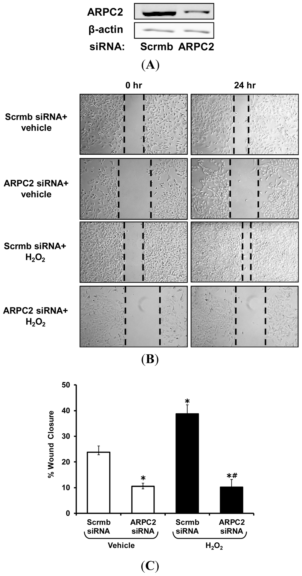 To investigate whether ARPC2 plays a role in VSMC migration, we used siRNA to gene silence ARPC2, treated VSMC with vehicle or H2O2, and measured migration as described in Figure 4. ARPC2 protein expression was suppressed 69% by ARPC2 siRNA compared to Scrmb control (Figure 6A). H2O2 treatment significantly increased migration of Scrmb siRNA-treated VSMC compared to vehicle treatment (Figure 6B,C). Importantly, gene silencing of ARPC2 abolished the effect of H2O2 on VSMC migration. These data demonstrate that H2O2 stimulates VSMC migration via ARPC2, providing a new role for ARPC2 as a downstream modulator of Nox signaling and possibly the effector of Nox1-induced VSMC migration.