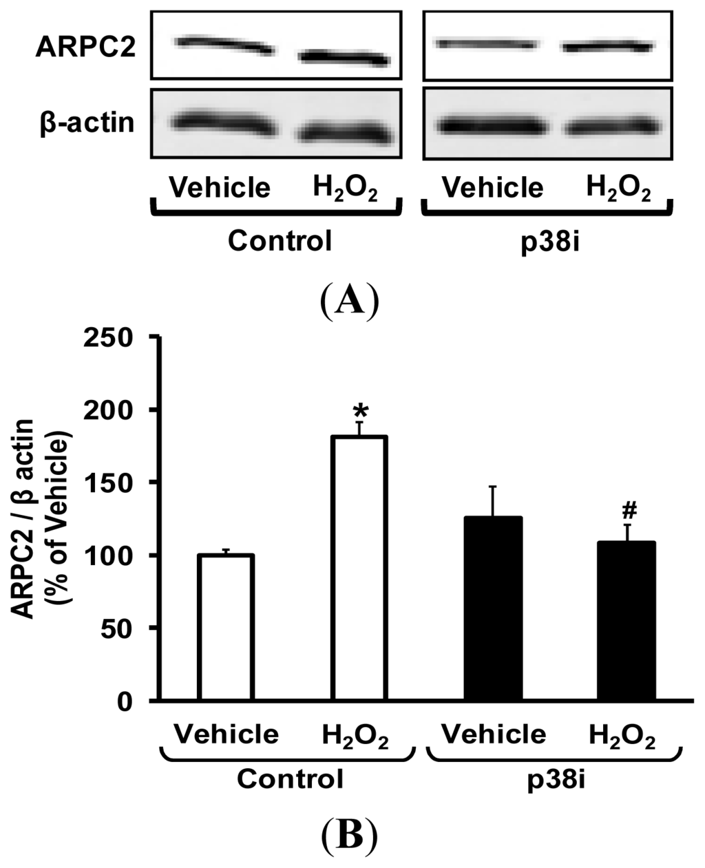 Inhibition of p38 MAPK pathway attenuates H2O2-induced ARPC2 expression. VSMC were pre-treated with the p38 MAPK inhibitor (p38i) SB203580 (1 μM, 1 h, Millipore), followed by treatment with vehicle or H2O2 (50 μM) for 3 h. VSMC lysates were subjected to Western blot and probed with polyclonal antibodies against ARPC2 and β-actin. (A) Representative Western blot showing ARPC2 and β-actin expression in control- and p38i-treated VSMC incubated with vehicle or H2O2; (B) Bar graphs representing averaged optical density data expressed as a ratio of ARPC2 to β-actin (n = 4). Data represent the mean ± SEM. *p < 0.05 vs. Control + vehicle treatment. #p < 0.05 vs. Control + H2O2 treatment.