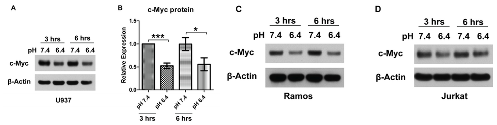 The expression of the critical cell regulator c-Myc was examined in U937 lymphoma cells treated with the physiological pH 7.4 and the acidic pH 6.4. Western blotting with a c-Myc-specific antibody revealed that the c-Myc protein level was reduced by approximately 50% under the 3-h and 6-h treatment of pH 6.4 when compared to the pH 7.4 treatment (Figure 1A,B). Similar c-Myc downregulation by acidic pH was also observed in Ramos lymphoma cells and Jurkat T-cell leukemia cells (Figure 1C,D).