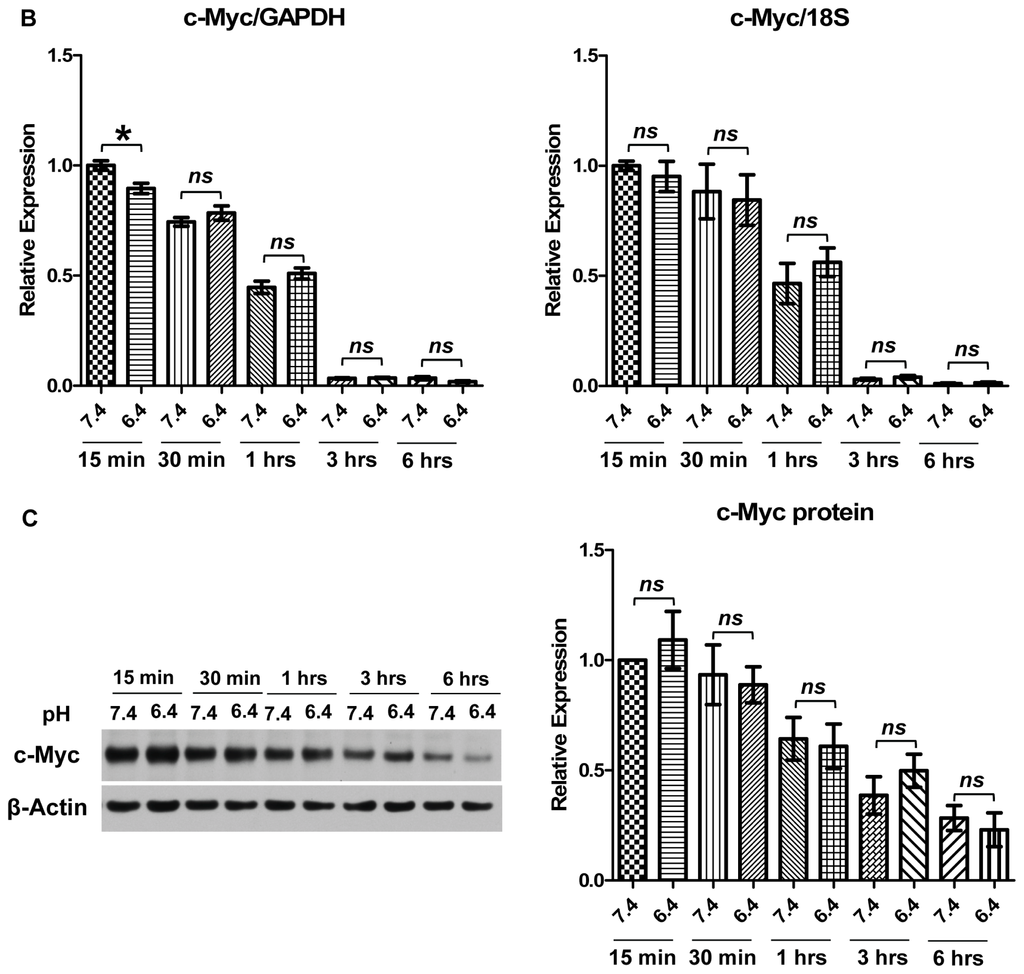 c-Myc transcriptional level, but not mRNA or protein stability, is downregulated by acidosis in U937 cells. (A) c-Myc mRNA is decreased by pH 6.4 treatment. U937 cells treated with pH 7.4 or pH 6.4 for three and 6 h were subject to total RNA isolation and real-time RT-PCR using c-Myc-specific primer probes. GAPDH (glyceraldehyde 3-phosphate dehydrogenase) was used as an internal control for normalization; (B) c-Myc mRNA stability is not altered by acidosis. U937 cells grown in HEM (7.5 mM HEPES, 7.5 mM EPPS and 7.5 mM MES)-buffered medium with 5 μg/mL actinomycin D at pH 7.4 or pH 6.4 for the indicated times were subject to total RNA extraction and real-time RT-PCR using c-Myc-specific primer probes. GAPDH (left) and 18S rRNA (right) were used as internal controls. The expression of c-Myc under 15 min of pH 7.4 plus actinomycin D treatment was set as one; (C) c-Myc protein stability is not altered by acidosis. Left panel: U937 cells grown in HEM-buffered medium with 50 μg/mL cycloheximide (CHX) at pH 7.4 or pH 6.4 for the indicated times were subject to total protein extraction and Western blot using anti-c-Myc antibody. β-Actin was used as a loading control. Right panel: quantification of Western blot results. The expression of c-Myc under the 15-min treatment with pH 7.4 and CHX was set as one. The data presented were derived from at least three biological replicates. Error bars indicate ±SEM. *p < 0.05; ***p < 0.001; ns, not significant (p > 0.05).