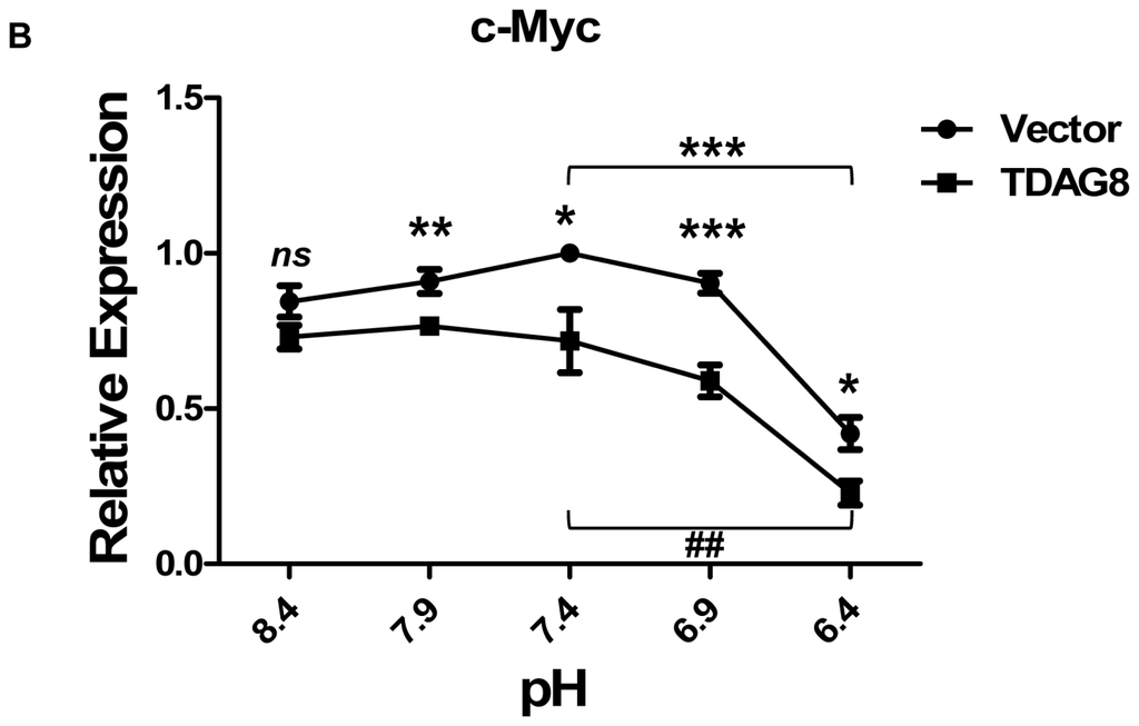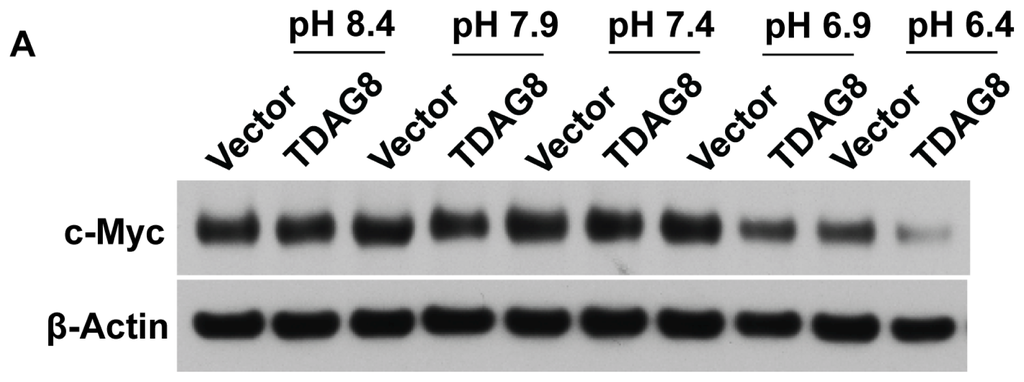 We further examined the pH-dependence of c-Myc regulation more thoroughly by assessing the effects of a wide range of pH, including pH 8.4 (4 nM H+), pH 7.9 (12.6 nM H+), pH 7.4 (40 nM H+), pH 6.9 (126 nM H+) and pH 6.4 (400 nM H+). A left shift of the pH response curve was clearly observed in U937/TDAG8 cells in comparison to U937/vector cells (Figure 4), suggesting that TDAG8 overexpression makes U937 cells more sensitive to the increase of acidity and, also, further reduces c-Myc expression. At pH 8.4 in which TDAG8 has minimal activity, the expression of c-Myc was not significantly different in U937/vector and U937/TDAG8 cells (Figure 4A,B). These results suggest that TDAG8, responsive to the increase of acidity, downregulates c-Myc expression in U937 lymphoma cells.