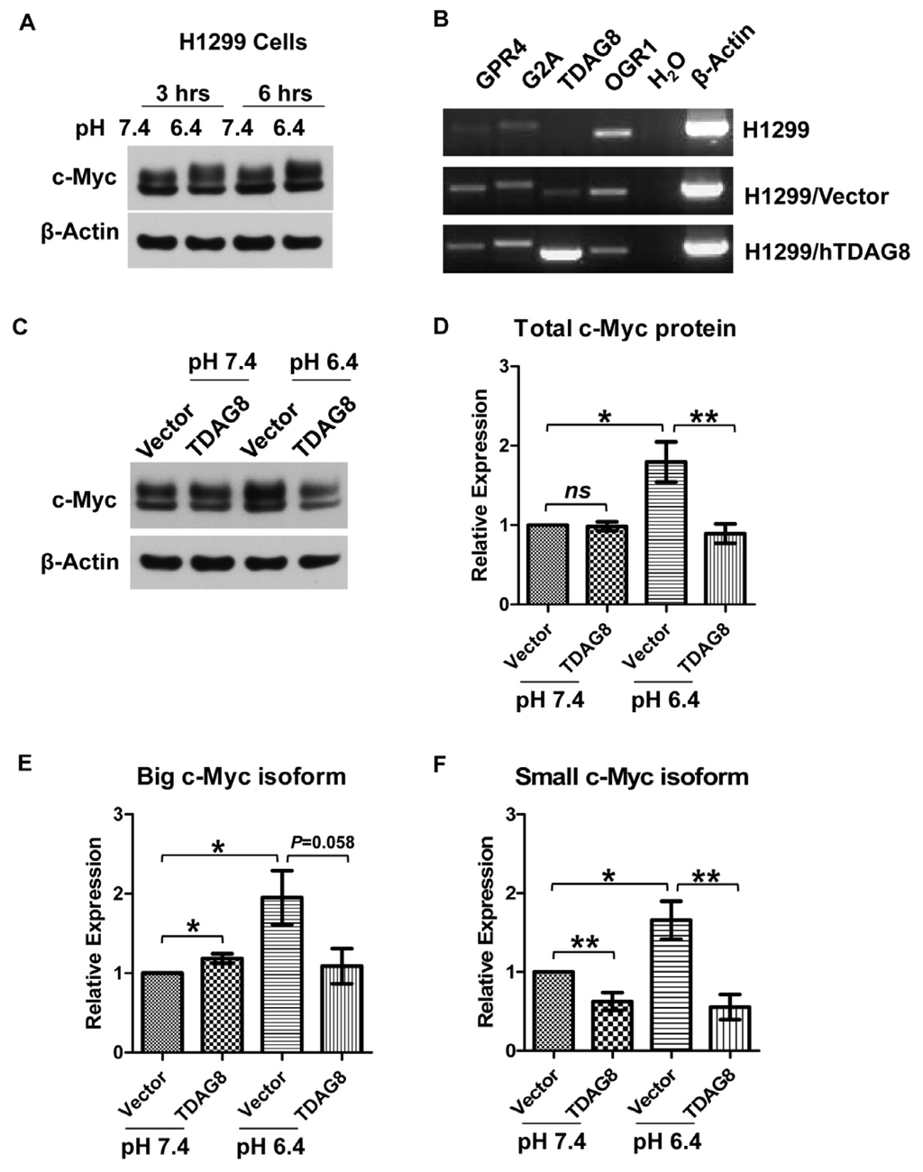 Ectopic overexpression of TDAG8 inhibits the upregulation of c-Myc protein by acidosis in H1299 cells. (A) c-Myc protein is moderately increased by acidosis in H1299 cells. Cells treated with HEM-buffered RPMI medium at pH 7.4 or pH 6.4 for three and 6 h were subject to Western blot assay using anti-c-Myc antibody. β-Actin was used as a loading control; (B) Low expression of proton-sensing GPCRs in H1299 cells. Total RNAs were isolated from H1299 parental, H1299/vector and H1299/hTDAG8 cells and subject to RT-PCR using gene-specific primers of GPR4, G2A, TDAG8 and OGR1. β-Actin was used as a positive control; (C) c-Myc protein is reduced by ectopic overexpression of TDAG8. Cells were treated with HEM-buffered RPMI medium at pH 7.4 or pH 6.4 for 3 h and, then, subject to Western blot assay using anti-c-Myc antibody. β-Actin was used as a loading control; (D–F) Quantification of Western blot results from (C). The expression of the total (D), big isoform (E) and small isoform (F) of c-Myc were quantified based on six Western blot repeats. The expression of c-Myc under the 3-h pH 7.4 treatment was set as one. Error bars indicate ±SEM. *p < 0.05; **p < 0.01; ns, not significant (p > 0.05).