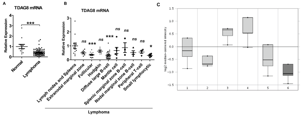 TDAG8 expression is lower in lymphomas than that in normal lymphoid tissues. (A,B) Human lymphoma tissue cDNA arrays (OriGene Technologies) were subject to real-time RT-PCR using TDAG8 specific primer probes. β-actin was used as an internal control for normalization. TDAG8 expression was compared between non-tumorous lymphoid tissues (lymph nodes and spleens) and all tested lymphoma tissues (A) or different subtypes of lymphoma tissues (B). The expression of TDAG8 in lymph nodes and spleens was set as one. Each dot represents an individual sample. Error bars indicate ±SEM. *p < 0.05; ***p < 0.001; ns, not significant (p > 0.05); (C) Analyses of the Oncomine cancer microarray database revealed that TDAG8 expression was reduced by two-fold in follicular lymphoma in comparison to normal lymphocytes (p < 0.001). x-axis: 1, B-lymphocyte; 2, centroblast; 3, memory B-lymphocyte; 4, naive pregerminal center B-lymphocyte; 5, small cleaved follicle center cell; 6, follicular lymphoma. y-axis: log2 median-centered intensity.