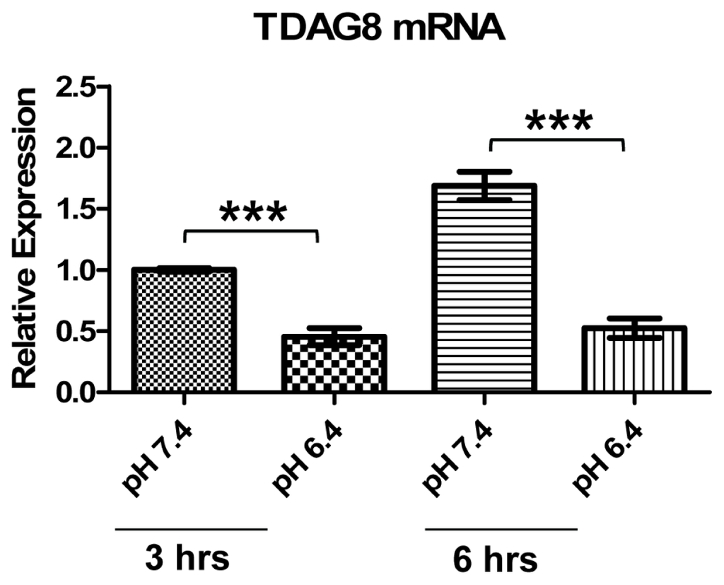 Since the tumor microenvironment is characteristically acidic, we investigated whether acidosis might affect TDAG8 expression in U937 lymphoma cells. The real-time RT-PCR results showed that TDAG8 mRNA was reduced by more than 50% under the three-hour pH 6.4 treatment compared to the pH 7.4 treatment (Figure 7). When the treatment was extended to 6 h, the reduction of TDAG8 mRNA by acidic pH was about 70%, whereas the TDAG8 level was moderately increased in the pH 7.4 treatment group (Figure 7). These results suggest that acidosis can downregulate the expression of the TDAG8 pH-sensing receptor, and this may represent a potential mechanism by which TDAG8 mRNA is decreased in lymphomas in comparison to non-tumorous lymphoid tissues, due to acidosis in the tumor microenvironment (Figure 6).