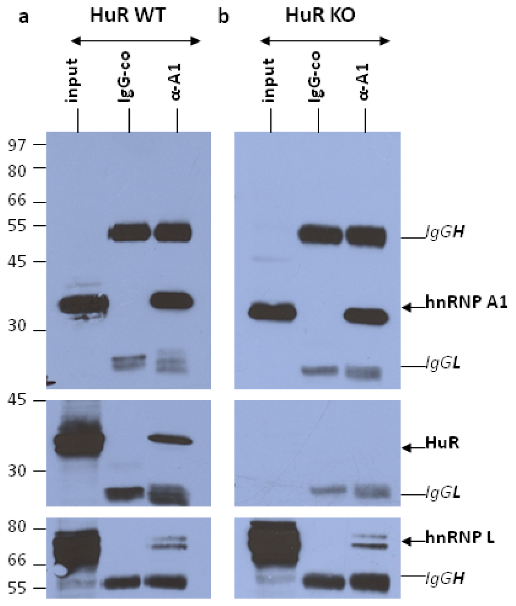2.2. Differential Association of Target RNA Transcripts with hnRNP A1-RNP Complexes in Nuclear Extracts of HuR-Containing and HuR-Lacking MEFs