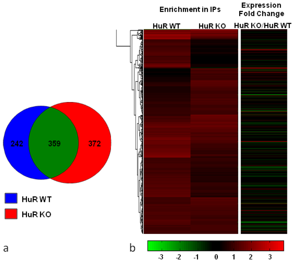 hnRNP A1-RNP-associated RNA targets in nuclear extracts of HuR WT and HuR KO MEFs (a) Venn Diagram representing the comparison of target genes between the two cell types following microarray data analysis; (b) Hierarchical clustering on the union of the identified RNA targets in HuR WT and HuR KO cells, depicting their differential association with hnRNP A1-RNP complexes in both cell types. Their expression fold change in total RNA is shown in a separate heat map on the right.