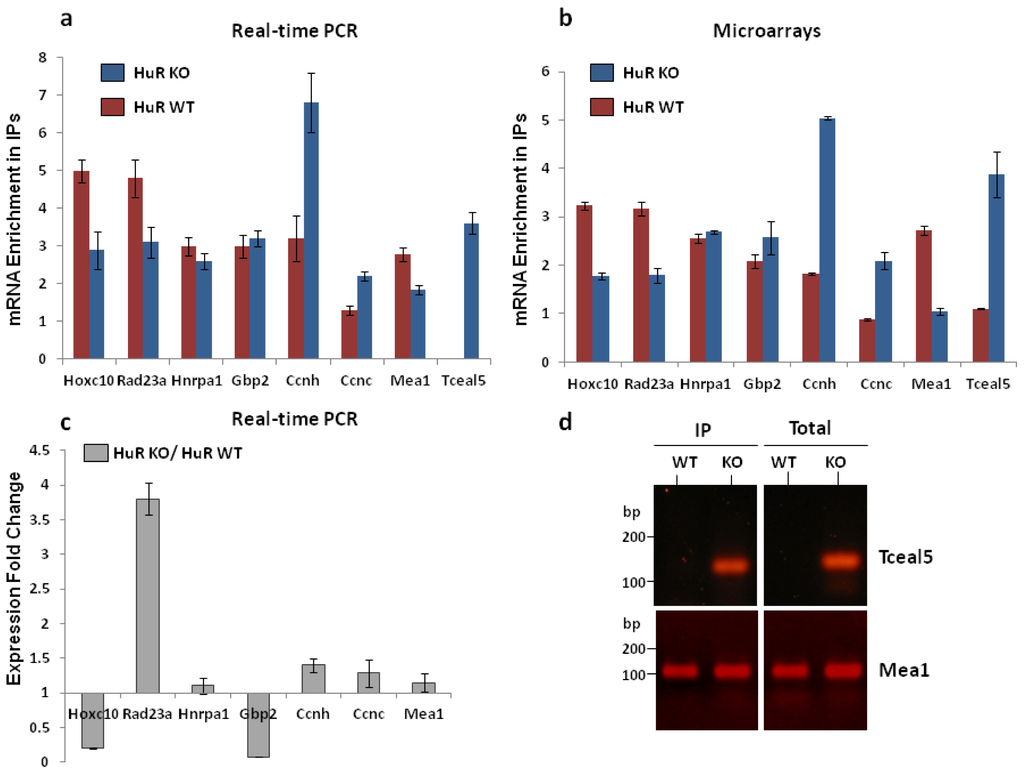 Validation of RIP-Chip data (a) RT-qPCR on RNA isolated from hnRNP A1 IPs and total nuclear extracts was performed to calculate the enrichment of mRNA for 8 target genes in HuR WT and HuR KO cells, namely Hoxc10, Rad23a, HnRNP A1, Gbp2, Ccnh, Mea1 and Tceal5 and compared to the microarray analysis; (b) Gapdh mRNA was used for normalization. The signal for Tceal5 mRNA transcript in HuR WT cells remained at the background level. Values represent the mean of three independent experiments performed in triplicates and error bars the standard deviations; (c) Fold change in expression of the selected genes in HuR KO as compared to HuR WT cells as determined by RT-qPCR on total nuclear RNA from the two cell types. Values and error bars are as described above. Genes with an expression fold change <1 correspond to down-regulated genes and are graphically shown in the opposite direction; (d) Agarose gel electrophoresis of the products of two RT-qPCR reactions, namely for Tceal5 and Mea1 transcripts, indicating that Tceal5 mRNA was undetected in HuR WT cells even after extension of the reaction cycles. The amplicon corresponding to Mea1 is shown as a positive control.