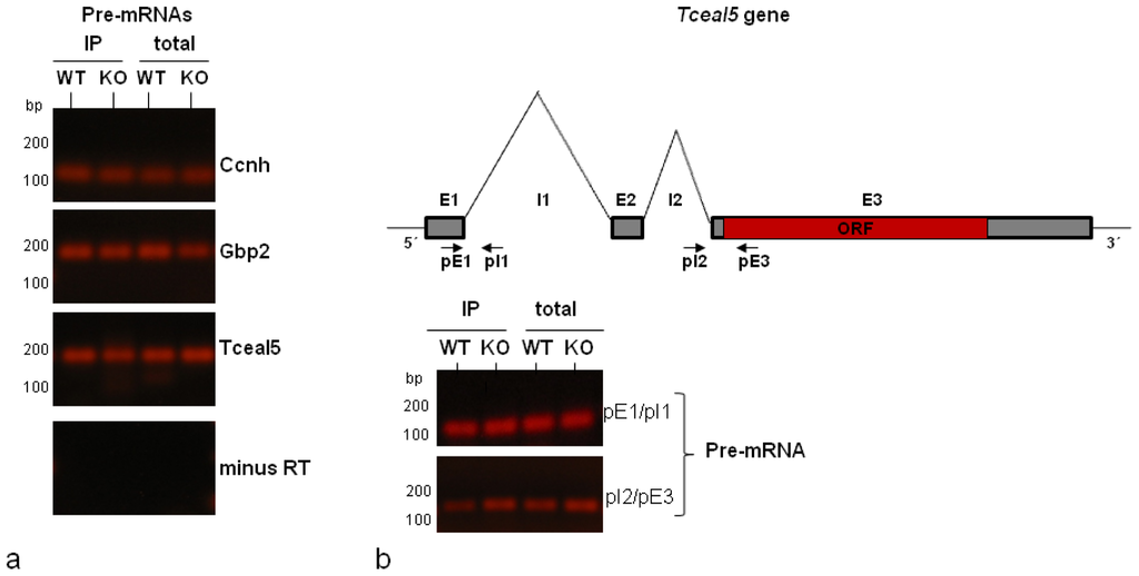 An unexpected finding of the above assay was the detection of the Tceal5 pre-mRNA in both HuR-lacking and HuR-containing cells, in clear opposition to the absence of its mature mRNA in HuR WT cells (compare Figures 3c and 4a). The schematic diagram of Figure 4b, outlines the Tceal5 gene organization consisting of three exons (E1–E3). Exons E1–E2 and the two intervening sequences (I1 and I2) are located at the 5′ end, while exon E3 contains the open reading frame (ORF) and the 3′UTR of the gene. In the spliced mRNA, the joined E1–E2 exons form the major part of a 5′UTR region. The pair of primers pE1/pI1 that corresponded to the first exon (E1) and intron (I1) was initially used to detect the Tceal5 pre-mRNA product shown in Figure 4a. Moreover, the application of a second pair of primers located in intron I2 and exon E3 (pI2/pE3) was able (as in the case of the pE1/pI1 pair) to amplify a Tceal5 pre-mRNA product, as shown in Figure 4b upon the parallel application of both pair of primers. Based on the above, we have confirmed the association of Tceal5 pre-mRNA with the hnRNP A1-RNP complexes in both HuR WT and HuR KO, with the spliced mRNA being unique to the HuR KO cells. The simplest way to interpret this interesting finding is to hypothesize a post-transcriptional regulatory mechanism operating on the Tceal5 gene, at the level of pre-mRNA splicing.
