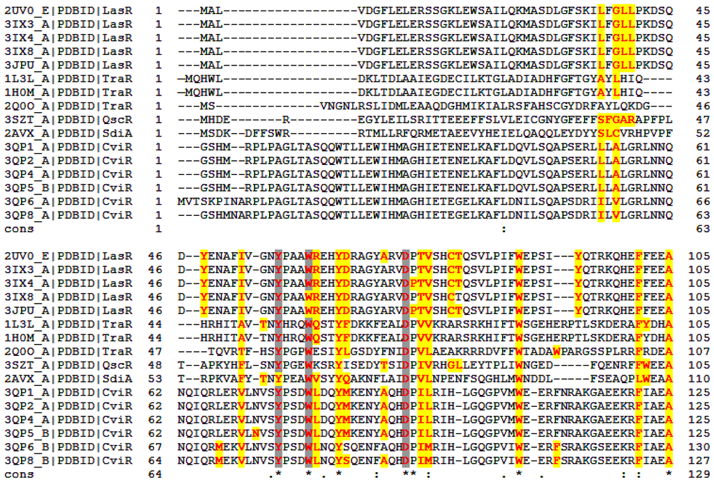 Structure-based multiple sequence alignment of the quorum sensing (QS) LuxRs whose structures have been solved to date. The residues directly involved in ligand binding are in bold and colored in red. The residues highlighted in yellow and in gray are engaged in hydrogen bonding and in hydrophobic interactions with the ligand, respectively. Stars highlight conserved positions; colon and period indicate respectively conservation between groups having strong or weak similarity. The unique identification PDB code (PDB_ID) of the 16 analyzed structures is given.