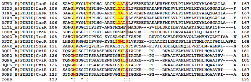 Structure-based multiple sequence alignment of the regulatory domains of all the QS LuxRs whose experimental three-dimensional structural information (obtained by X-ray crystallography or by NMR spectroscopy) is available (i.e., TraR from Agrobacterium tumefaciens and from Sinorhizobium fredii NGR234, LasR and QscR from Pseudomonas aeruginosa, CviR from Chromobacterium violaceum and SdiA from Escherichia coli) was performed by Expresso []. Figure 1 shows the multiple sequence alignment, based on structural information, having a main score (the total consistency value) of 71 (100 being the full agreement between the considered alignment and its associated primary library that has been computed as a first step of the consistency-based protocol exploited by Expresso), albeit the overall level of sequence identity or homology is quite low according to the calculated consensus sequence. It is interesting to note that even if the individual scores are 74 for LasR, 74 and 77 for the A. tumefaciens TraR and for its homolog from S. fredii NGR234 respectively, 76 for QscR, 56 for SdiA and 71 for CviR, regions encompassing residues 21–132 (TraR numbering) are characterized by an even higher level of consistency that has been prompted to reflect a higher level of accuracy [].