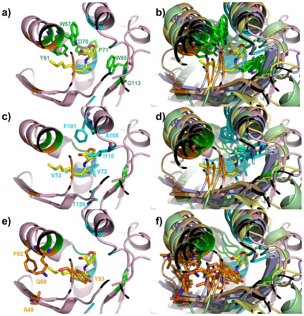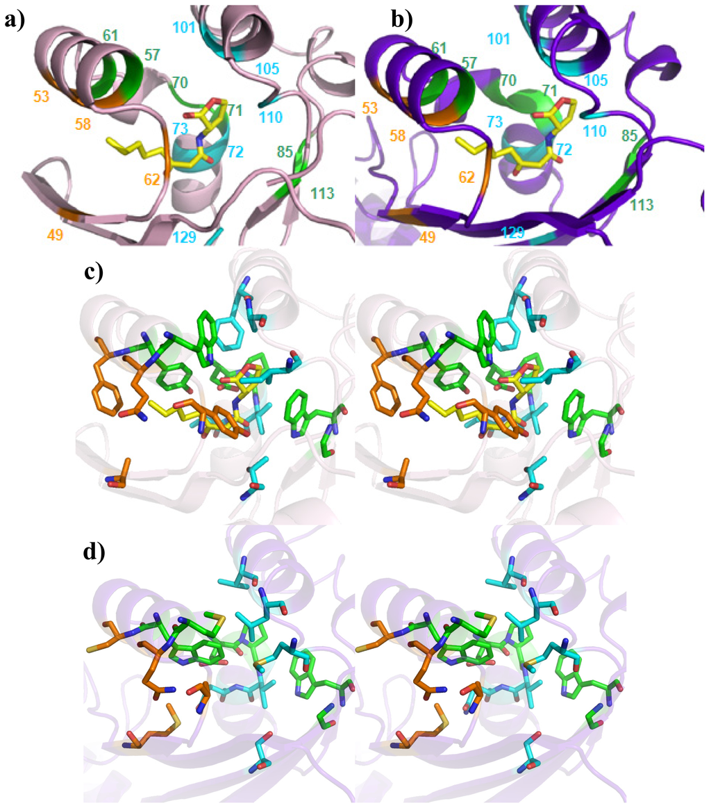 From a structural perspective, it is interesting to note that not only the Cα positions but also the side chains orientations of all the six conserved residues W57, Y61, D70, P71, W85 and G113 (hereafter called Cluster 1, highlighted by a star in Figure 1 and colored in green in Figure 2) superimpose in all the analyzed structures rather well (Figure 2b). To this end only W57, Y61, D70 and W85 are directly involved in ligand binding (see Figures 1 and 2a). Residues P71 and G113 are located close to the binding site (Figure 2a) and are likely involved in the proper side chain orientation of D70 and W85, respectively. In this respect it is worth noting that in all of the analyzed structures, residues P71 and G113 adopt a trans and cis peptide conformation, respectively.