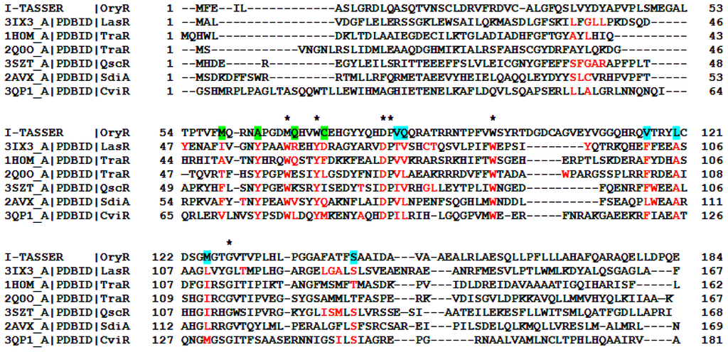 To extend this detailed molecular cartography of the regulatory domain of the QS LuxR family to the PAB LuxR solos subfamily [], OryR, the prototype of this subfamily, has been modeled and structurally aligned, based on secondary structure prediction, using I-TASSER [] (see Figure 3).
