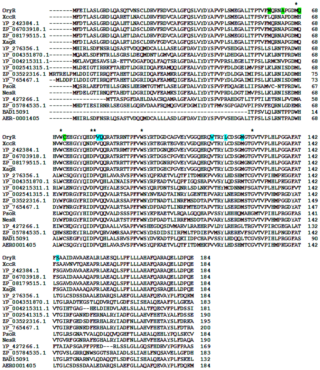 Structure-based multiple sequence alignment of the QS LuxRs with the prototype of the PAB LuxR solos subfamily. The residues of the QS LuxR involved in ligand binding are colored in red. The homologous residues of OryR, the prototype of PAB LuxR solos subfamily, belonging to Cluster 1 are highlighted by a star while the ones belonging to Cluster 2 and Cluster 3 (see text) are highlighted in cyan and in green respectively.