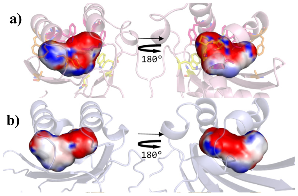 In order to corroborate the results of this analysis, the shape and the physico-chemical properties of the ligand-binding sites were evaluated. In Figures 6 and 7, on comparing the overall shape and the electrostatic and lipophilic potentials, respectively, of the ligand-binding sites of QS LuxRs, confirms the tripartite topology previously outlined (mapping the conserved core in yellow, the specificity patch in magenta and the variability patch in orange). Furthermore the physico-chemical properties mapped on the ligand-binding site of the OryR model reveal an increased negative potential (Figure 6) and a decreased hydrophobicity (Figure 7) in comparison to QS LuxRs, which most likely accounts for the structural determinants that are responsible for differences in the selectivity of the PAB LuxR solos subfamily with respect to QS LuxRs.