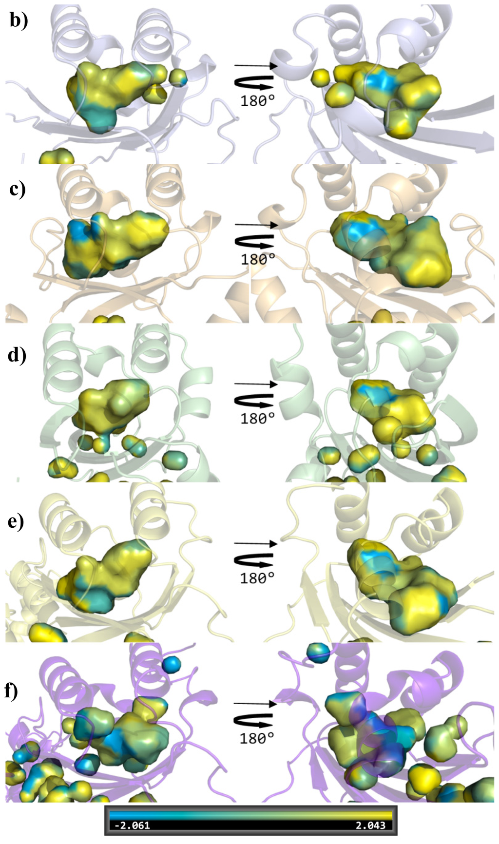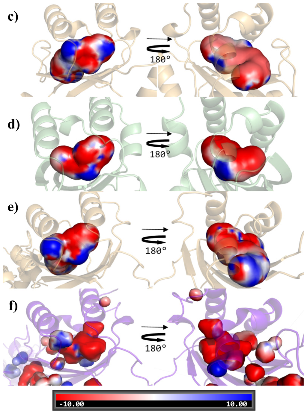Electrostatic potential of the ligand-binding sites of the QS LuxR and of the prototype of the PAB LuxR solos subfamily. (a) TraR (PDB_ID 1H0M []) in light pink (showing the side chains of the conserved core in yellow, of the specificity patch in magenta and of the variable patch in orange); (b) SdiA (PDB_ID 2AVX []) in light blue; (c) LasR (PDB_ID 3IX3) in light orange; (d) CviR (PDB_ID 3QP1 []) in light green; (e) QscR (PDB_ID 3SZT []) in light yellow; (f) OryR model in blue purple. Left column: top view of the ligand binding sites (same orientation of the previous Figures); Right column: bottom view (obtained by 180 degrees rotation around y axis). Figures produced by Pymol [].