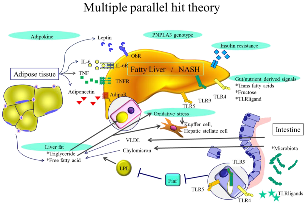 Multiple parallel hit theory. Genome-wide association studies have confirmed importance of patatin-like phospholipase 3 (PNPLA3) gene polymorphism in NAFLD. This genetic polymorphism can differentiate simple steatosis with or without minimal inflammation and fibrosis progressing to NASH. In some instances, inflammation could precede steatosis and anti-tumor necrosis factor (TNF)-α antibody improves steatosis in ob/ob mice. Obesity and diabetes induce insulin resistance, adipocyte proliferation and changes in intestinal flora. Adipokines such as IL-6 and TNF-α produced by adipocytes affect hepatocyte fat content and liver inflammatory environment. Gut-derived signals could be affected by ingested trans fatty acids, fructose, or TLR ligands. Ingested free fatty acids and free cholesterol induce ER stress and oxidative stress resulting in hepatic inflammation and fibrogenesis.