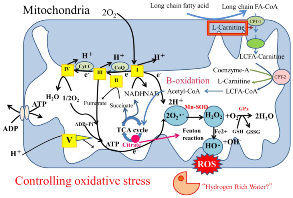 Mitochondria as producers of oxidative stress. High levels of plasma free fatty acids allow upregulation of hepatic free fatty acids. Long-chain fatty acids taken up into mitochondria as complexes with l-carnitine are then transferred to β-oxidation pathway. Under oxidative stress, oxidative reactions convert oxidized cofactors (NAD+ and FAD) into reduced cofactors (NADH and FADH2) and deliver electrons to respiratory chain. Imbalance between increased delivery of electrons to respiratory chain and their decreased outflow from this chain causes electrons and ROS products to accumulate. Anti-oxidant defenses such as superoxide dismutase (SOD), glutathione peroxidase (GPx) or catalase can metabolize hydrogen peroxide to non-toxic H2O. However, the Fenton and/or Haber-Weiss reactions generate highly reactive toxic ROS, hydrogen peroxide. Hydrogen as selective cytotoxic ROS scavenger and l-carnitine as mitochondrial function supporting factor might be good candidates for controlling mitochondrial oxidative stress.