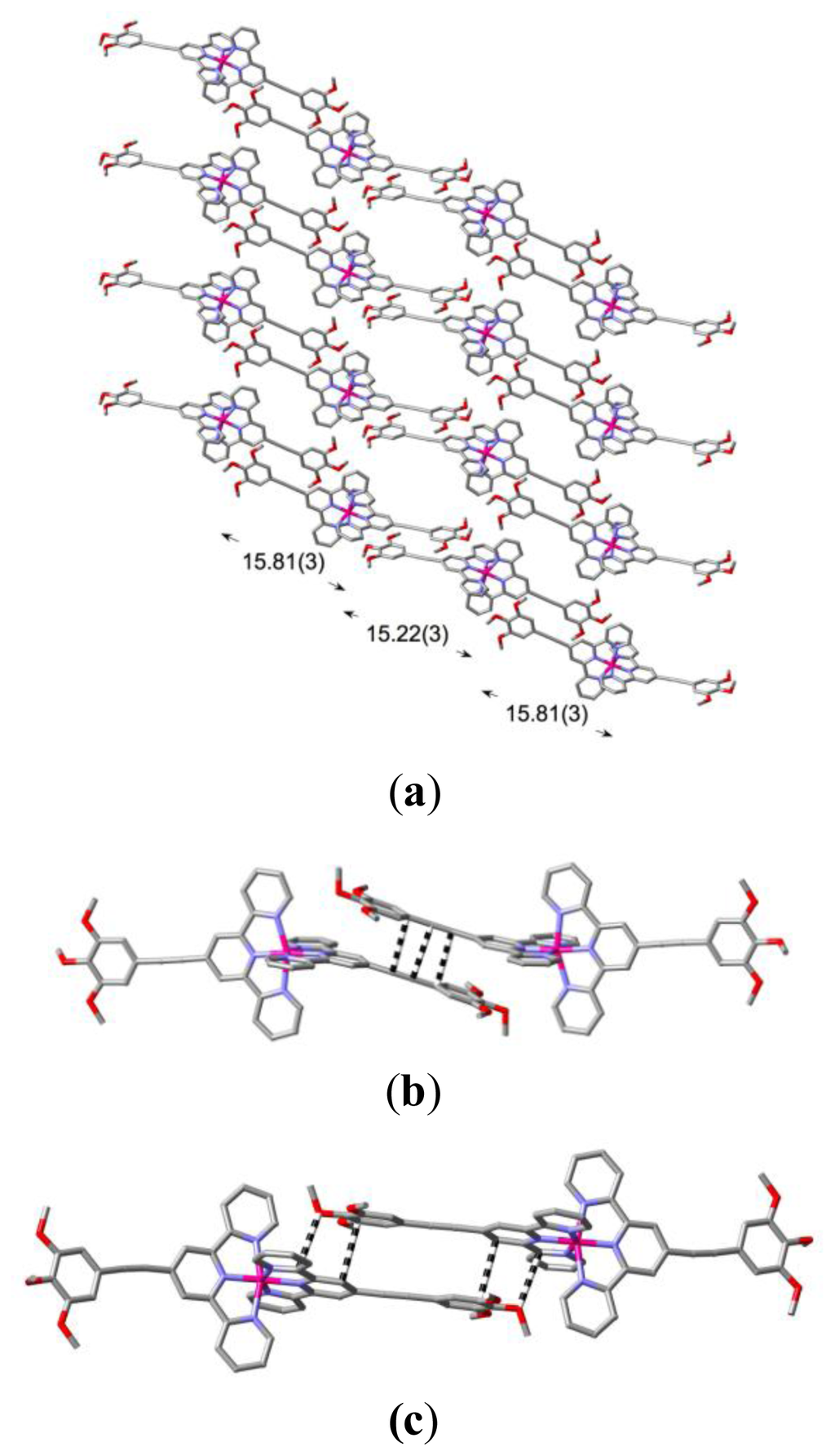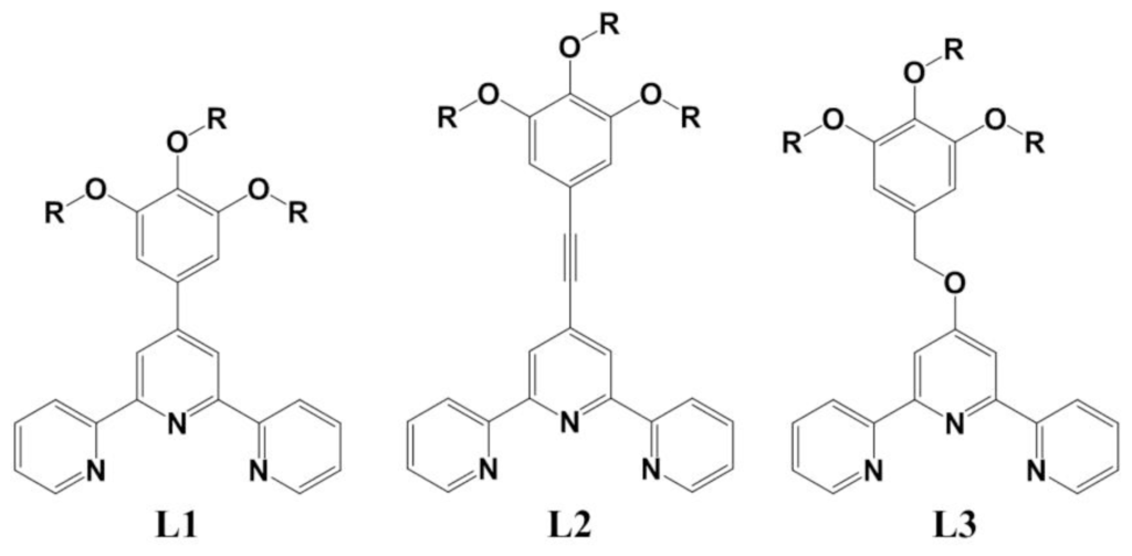 The effectiveness of 2, 2,2′;6′,2″-terpyridine as a ligand and the variety of functionality which may be introduced through substitution on this core [1] have engendered intense interest in the coordination chemistry and possible applications of this ligand and its derivatives [2]. One aspect of this chemistry which has been a particular concern of the present authors and their collaborators is the induction of mesomorphic behaviour in Co(II) and Fe(II) complexes as a means of controlling their magnetic properties involving “spin crossover” [3,4]. Very recently, it has been shown that the Co(II) complex of ligand L1 (Figure 1; R = C16H33), for example, undergoes a high-spin to low-spin change in magnetism which is triggered by a crystal- to-mesophase transition [5]. In this case, as in many others, [6] the introduction of a gallate- like substituent with three hexadecyloxy groups at the 4′ position of terpyridine proved sufficient to induce mesomorphism, here in the Co(II) complex as its tetrafluoroborate salt, while the analogous complex with short methoxy substituents showed only a single crystalline phase. Nonetheless, since liquid crystal behaviour in general is determined not only by interactions involving flexible alkyl-chain units but also by those involving more rigid units such as aromatic rings [7], the crystal structure [5] of this non-mesomorphic complex was of interest for its use in defining modes of interaction between core groups of the complex which could presumably influence the behaviour of the mesomorphic species. An interesting feature of the lattice of the complex was the loss of the “terpyridine embrace” [8,9] ascribed to aromatic–aromatic interactions [8–10] and which is a striking feature of the lattice of most M(II) complexes of unsubstituted terpyridine, although its loss may well be common to most such complexes of terpyridines with large substituents [11]. To explore further the role of a 3,4,5-trimethoxyphenyl substituent in determining the labile interactions of metal complexes of 4′-substituted terpyridine, we have structurally characterised not only other metal ion complexes of L1 but also various metal ion complexes of the related ligands L2 and L3 (Figure 1) and report the essential aspects of this work herein. The nature of the link between the terpyridine and trimethoxyphenyl units has proven to be of some significance.