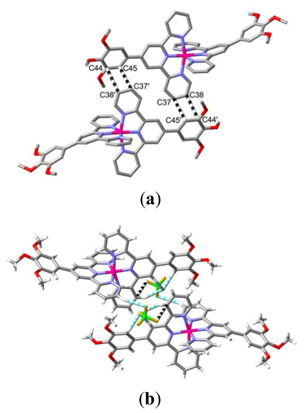 (a) Reciprocal π-type interactions (dashed lines) between trimethoxyphenyl- and pyridyl-group carbon atoms of cations (stick representations; H-atoms not shown) with Co…Co 10.621(3) Å within the lattice of [Co(L1)2](BF4)2·CH3CN·0.5H2O; (b) Bridging of the same pair of cations as in (a) via interactions with tetrafluoroborate anions of both CH…F (blue and white dashed lines) and F…π (black and white dashed lines) types.