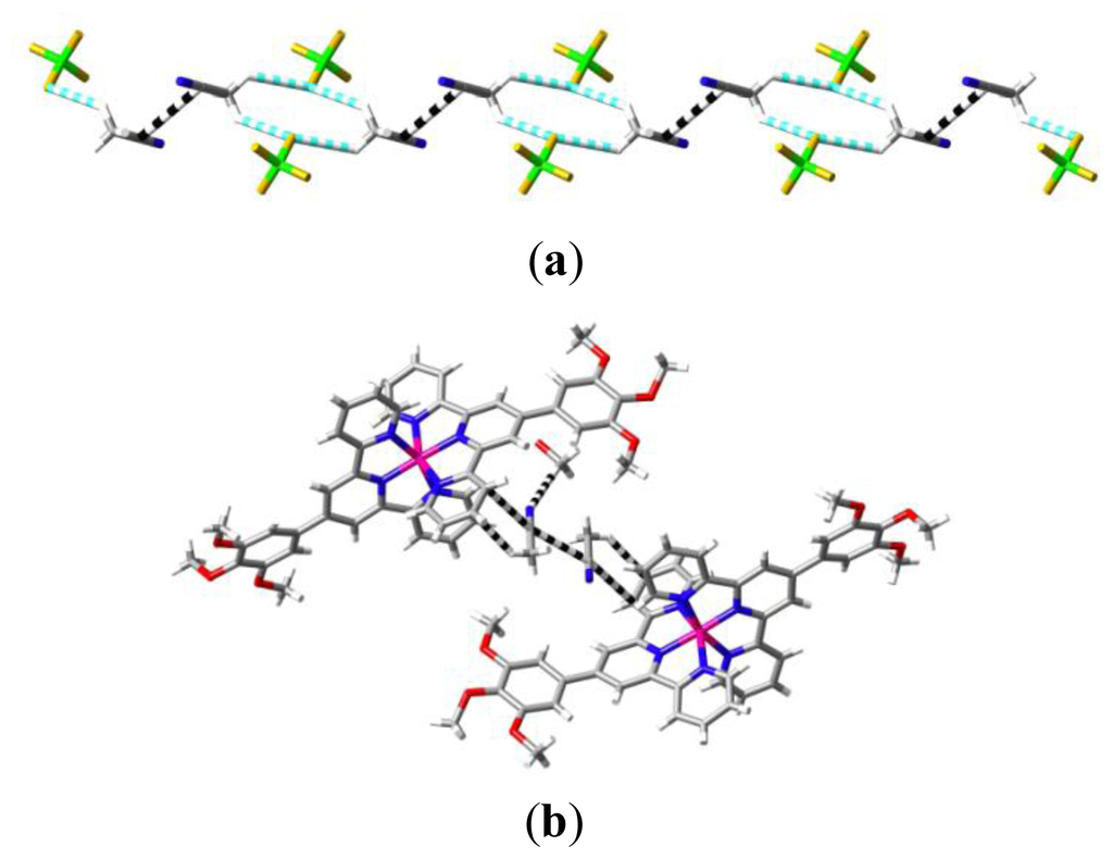 (a) Portion of the chain formed by bridging of pairs of antiparallel CH3CN dipoles by CH…F interactions (blue and white dashed lines) with F…H 2.570(2) and 2.564(2) Å for the two bonds of a given F. The nitrile-C…C-nitrile contacts, 3.267(6) Å, are shown as black and white dashed lines; (b) π-interactions involved in the bridging of two cations with Co…Co 13.947(6) Å by every one of the CH3CN pairs shown in (a). One of the nitrile-N…HC interactions involving a methoxyl group of a third adjacent cation is also shown.