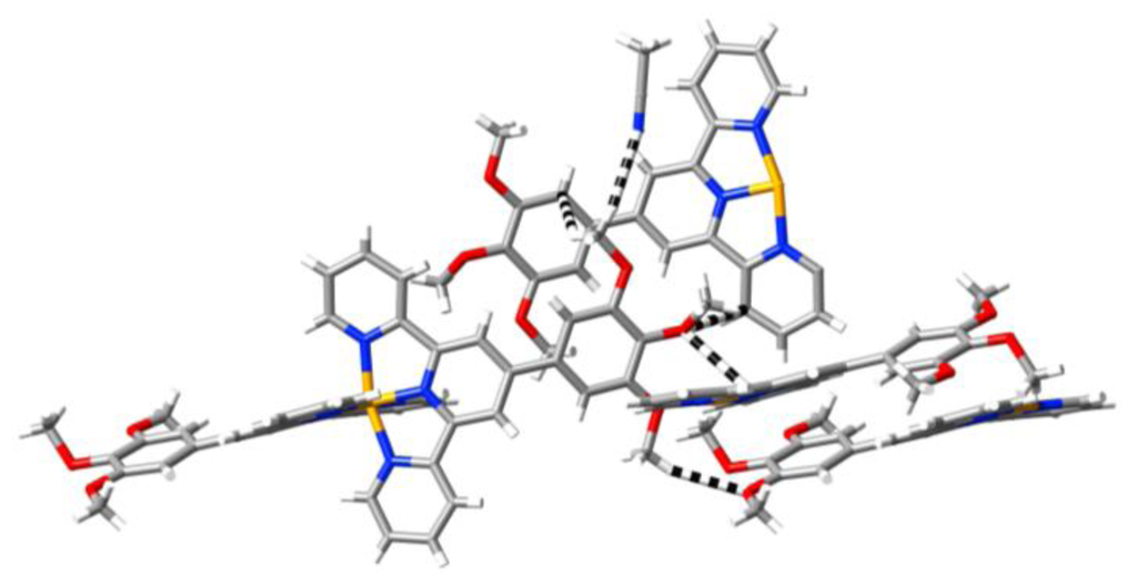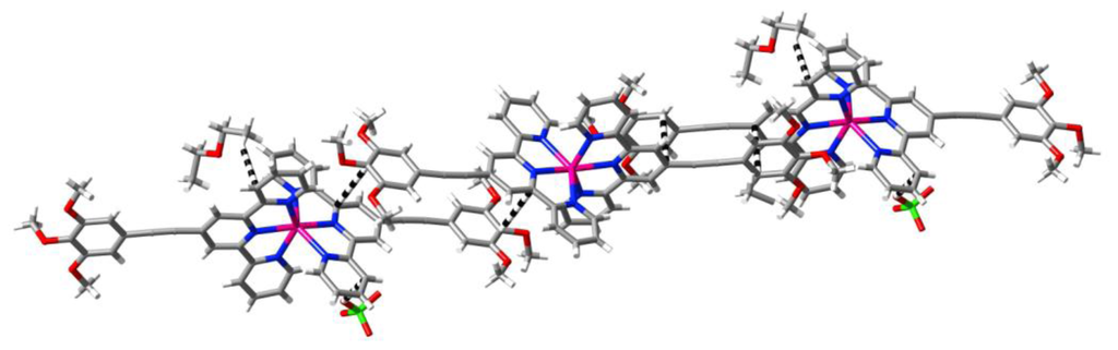 Given that the metal ions are encased in a large ligand sheath and that perchlorate and tetrafluoroborate are tetrahedral anions of similar size, it is unsurprising that [Fe(L1)2](ClO4)2·CH3CN and [Ni(L1)2](ClO4)2·CH3CN are essentially isostructural with [Co(L1)2](BF4)2·CH3CN·0.5H2O. Thus, there is again minimal evidence for a significant role of aromatic–aromatic, specifically phenyl–pyridyl, interactions in defining the lattice of these complexes, although the formation of bridges via π-type interactions between acetonitrile pairs and pyridyl rings is a feature of all three structures (with perchlorate H–bond bridging of the acetonitrile pairs being slightly further from symmetrical than that of tetrafluoroborate). Examination of the three structures using CrystalExplorer shows that the role of the trimethoxyphenyl groups in lattice construction is largely associated with the methoxy groups, principally through O…π interactions and H-bond acceptance by the oxygen atoms and H-bond donation, including CH…π, by the methyl groups, some examples of these interactions being shown for [Fe(L1)2](ClO4)2·CH3CN in Figure 4.