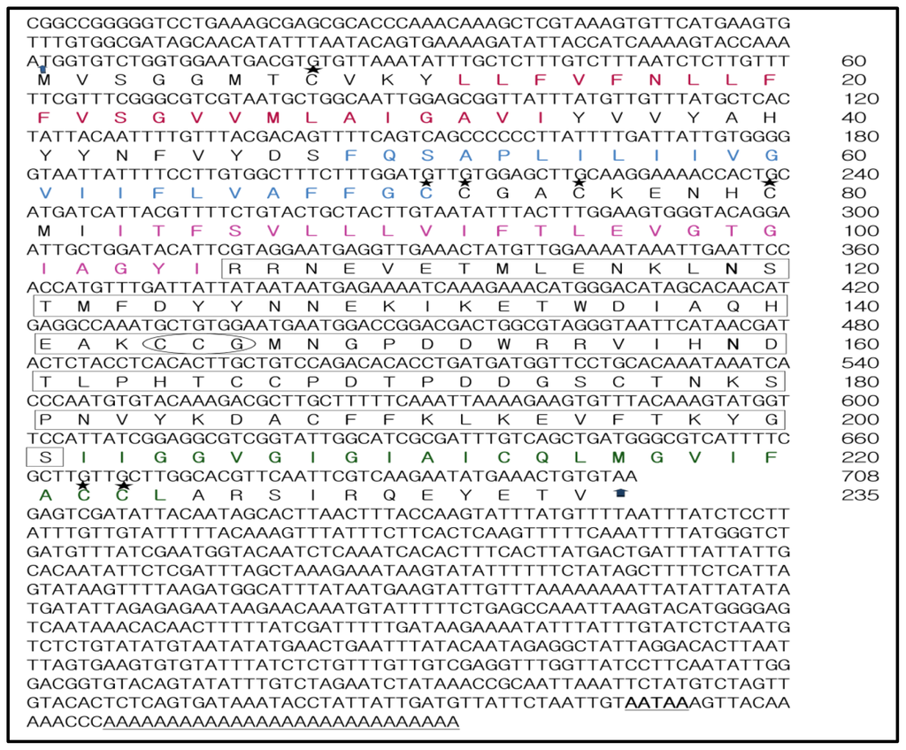 The transmembrane domains in proteins were predicted by TMHMM (Technical University of Denmark, Lyngby, Denmark). The palmitoylation sites at high threshold were predicted by CSS-Palm 3.0 (Cuckoo workgroup, Wuhan, China) [67]. The prediction of the putative signal peptide sequence was done at the Signal 4.0 server [68]. The ORF base composition and protein statistics including the theoretical MW and isoelectric point (pI) were performed using the EditSeq and Protean tool of Lasergene 9.0 software (DNASTAR Inc., Madison, WI, USA). The prediction of N-glycosylation sites was confirmed at NetNGlyc 1.0 server (Technical University of Denmark, Lyngby, Denmark). ProtScale [69] at ExPASy bioinformatics resource portal was used to predict the hydrophobicity quality of the protein [70]. ProtParam [71] at ExPASy bioinformatics resource portal was used for computing various physical and chemical parameters [72].