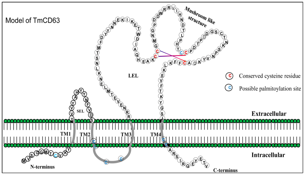 TMHMM analysis of the deduced amino acid sequence of TmCD63 indicated that the protein has four transmembrane domains (TM) (Figure S1) and can be categorized into TM4SF members. Apart from the four conserved TM domains spanning 23 amino acids, the protein consists of short N- and C-termini, short extracellular loop (SEL) and highly variable large extracellular loop (LEL). The TM1 domain begin from the 12th residue to the 34th residue, the TM2 domain from the 49th residue up to the 71st residue, the TM3 domain from 83rd amino acid residue to the 105th residue and the TM4 domain spanned from the 202nd to the 224th residue. The short N- and C-terminus of the protein spanned 11 amino acid residues each, whereas the SEL contained 13 amino acid residues. The LEL of the protein covered 97 amino acid residues and contained the highly conserved “Cys-Cys-Gly” motif, as well as a highly conserved “Cys188”, which defines the tetraspanin family members. The cysteines in the “Cys-Cys-Gly” motif formed a mushroom-like structure due to the presence of two intricate disulphide bonds. The “Pro-X-Ser-Cys” and “Cys-Cys-Gly” motif found in the LEL are hallmarks of the tetraspanin family (Figure 2). The model structure based on the amino acid sequence of TmCD63 also shows the presence of 8 palmitoylation sites, mostly with the juxtamembrane cysteine residues (Table 1). The short N-termini contained a palmitoylated cysteine at position 8, TM2 at position 71, intracellular sequence at positions 72 and 75 and TM4 at positions 222 and 223, excluding the SEL cysteine at position 166 that seems to be highly conserved as well. This is excluding the highly conserved cysteine residue in the SEL at position 188 (13 amino acid residues before TM4). The Kyte-Doolittle hydropathy plot of TmCD63 (Figure S2) revealed the four TM domains characteristic of the superfamily, as well as short extracellular (EC) region 1 and long EC2. The TM domains clearly showed a higher hydropathy score compared with the extracellular regions.