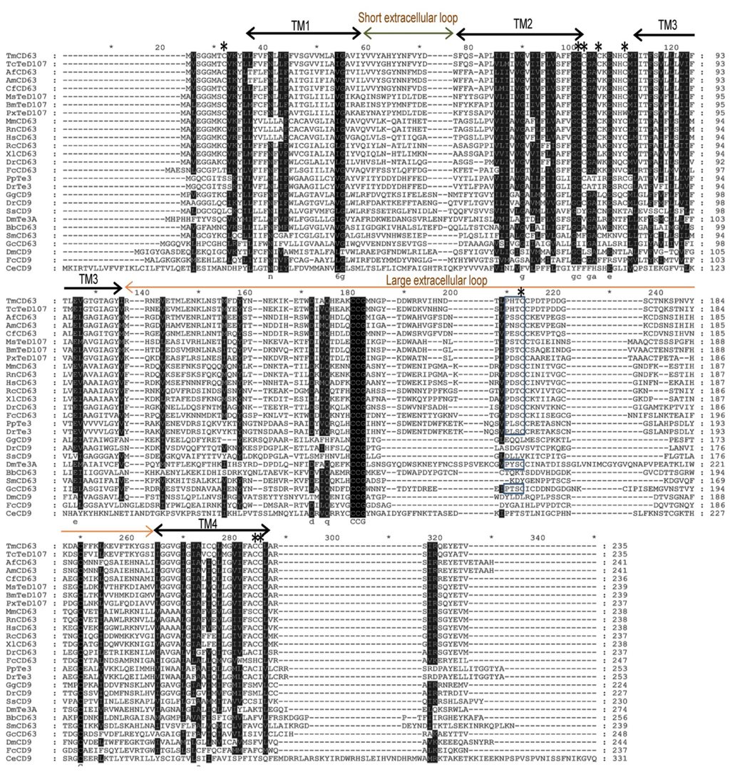 Since tetraspanins have many family members, sequences of model animals from invertebrate and vertebrate groups based on combination of BLAST and the cysteine patterns of LEL of tetraspanins were selected for analysis; (Figure 3). The alignment shows that the TM regions (I–IV) are more conserved than the LEL region. The “Cys-Cys-Gly” motif and “Cys188” show high degree of conservation in the LEL of the tetraspanin family members. Additionally, the palmitoylated cysteines show greater degree of conservation among the sequences included in the alignment. The “Pro-X-Ser-Cys” motif was found in T. molitor as well as its close relative Tribolium castaneum tetraspanin D107 (TcTeD107), although it was absent in the Branchiostoma and Schistosoma CD63 apart from the CD9 family of the tetraspanins.