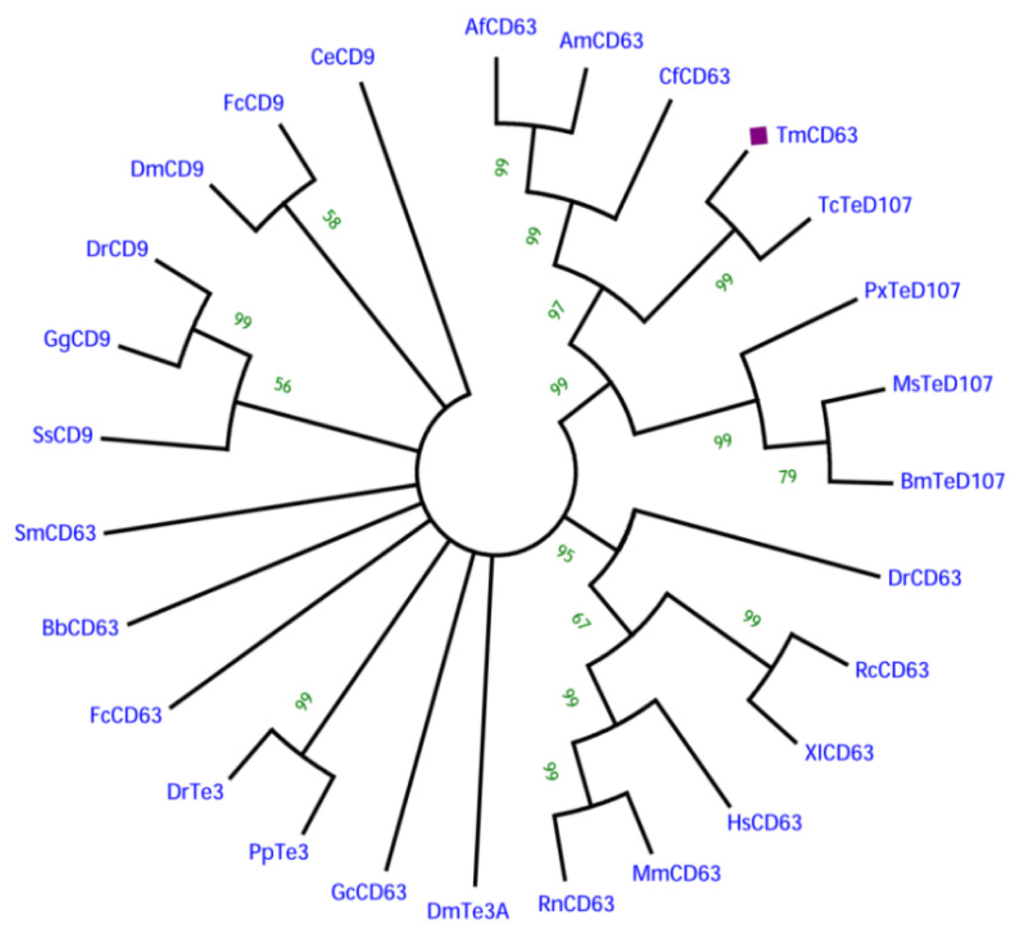 4.4. Cloning of the Full-Length cDNA of TmCD63