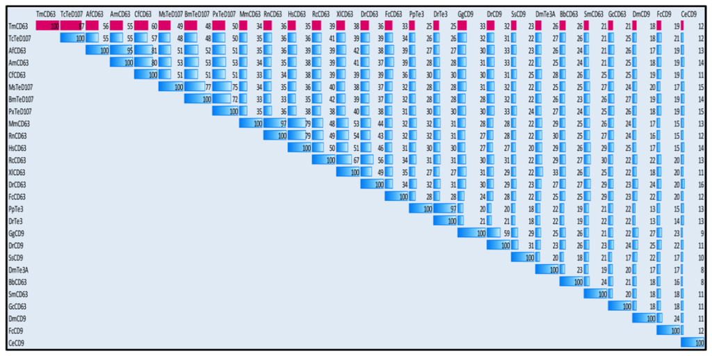 Percentage pairwise identities of TmCD63 with tetraspanin amino acid sequences from various animals including insects. The percentage identities have been highlighted using blue data bars with red bars indicating identities of TmCD63.