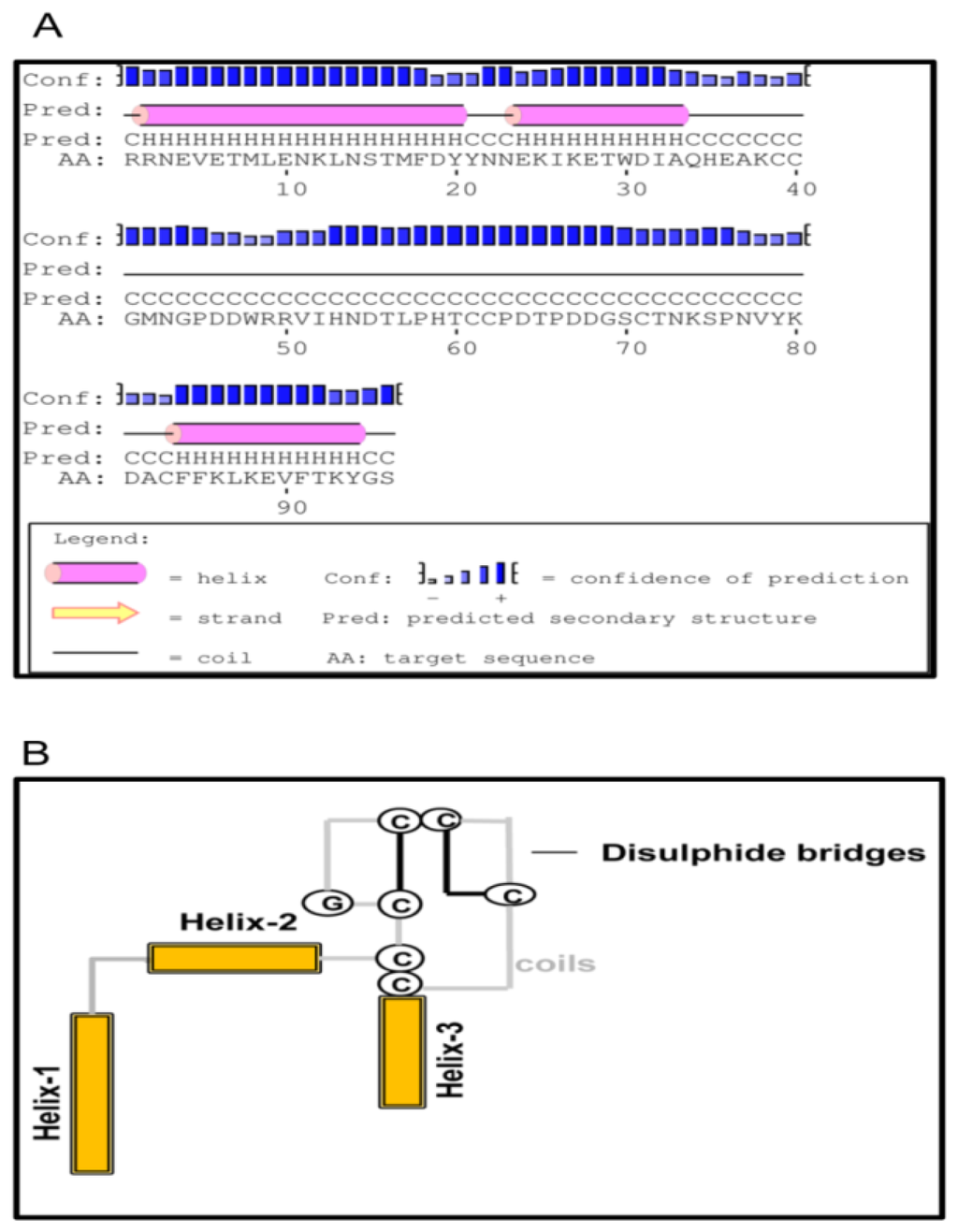Modeling of LEL topology of TmCD63. (A) Secondary structure prediction of TmCD63 LEL using PSI-PRED software. The helical regions (three in number) are demarcated by an extensive coil region that encompasses the mushroom-like structure, characteristic of tetraspanin superfamily; and (B) Schematic representation of TmCD63 LEL topology containing six cysteine residues.