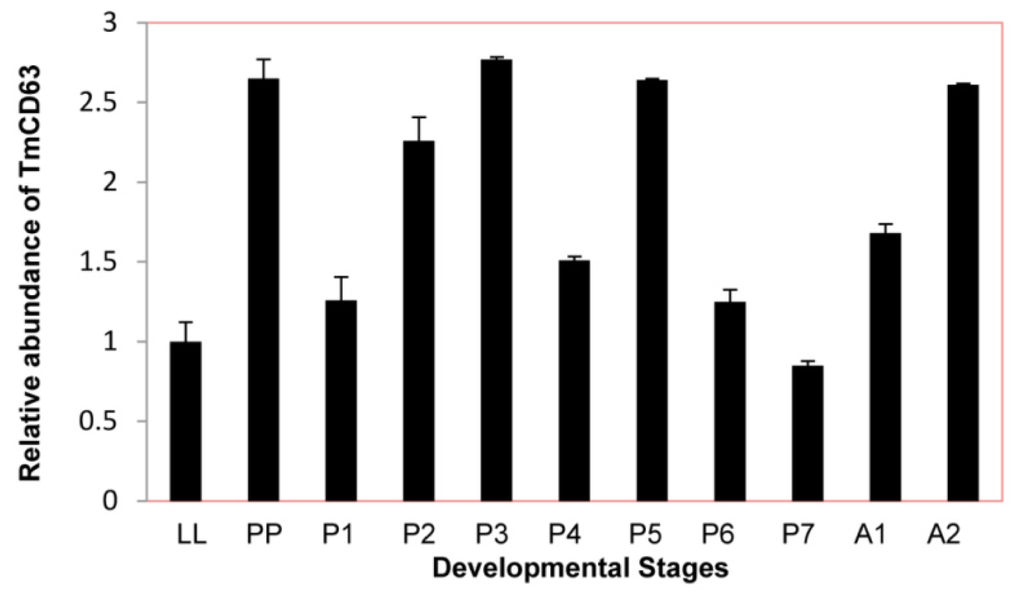 Developmental expression patterns of TmCD63 in mealworm beetle T. molitor. Ribosomal protein L27a (T. molitor) was used as an internal control to normalize RNA levels between samples. The relative expression was calculated by comparing the cycle threshold value of TmCD63 to L27a. Vertical bars represent standard deviations (n = 3). The analysis was performed using real-time PCR based on SYBR green. LL: Late larva; PP: Prepupa; P1: Pupa day 1; P2: Pupa day 2; P3: Pupa day 3; P4: Pupa day 4; P5: Pupa day 5; P6: Pupa day 6; P7: Pupa day 7; A1: Adult day 1; A2: Adult day 2.