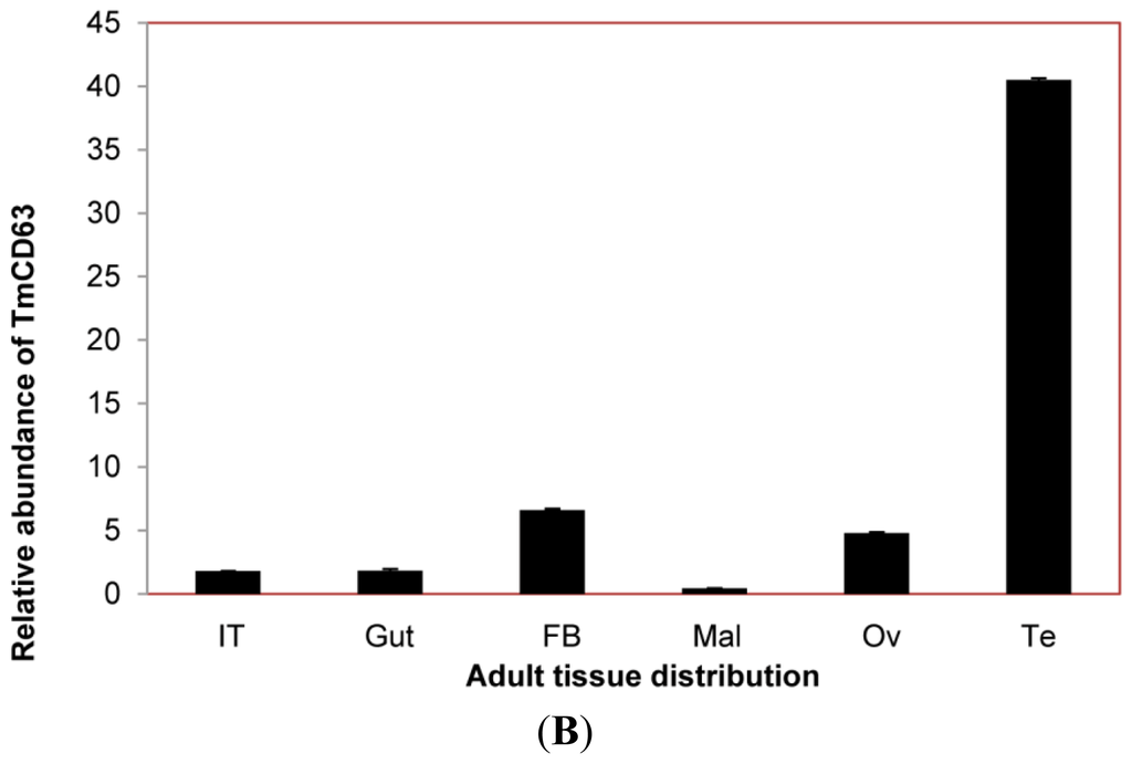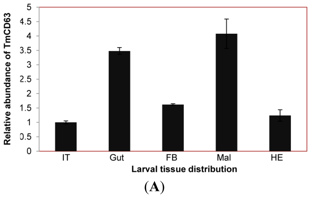 The expression of TmCD63 mRNA was investigated in various tissues of final instar larvae and adult of T. molitor (Figure 8). TmCD63 was highly expressed in the gut and Malphigian tubules of the larvae, but detected at low levels in fat body, integument and hemocytes. The relative expression level of TmCD63 was the highest in Malphigian tubules among the five tissues with about 4-fold higher presence as compared with the integument. The TmCD63 mRNA was found to be strikingly higher in the adult testis with ~40 fold expression compared with the reference of Malphigian tubules. We therefore speculate that TmCD63 plays a key role in differentiation of the testicular cells in adult of T. molitor. The high expression of TmCD63 transcripts in the potent immune organs of T. molitor larvae may suggest its role in innate immune mechanisms of insects. Expression levels of L27a gene of T. molitor, employed here as an internal control, appeared to be similar and unchanged among developmental stages.