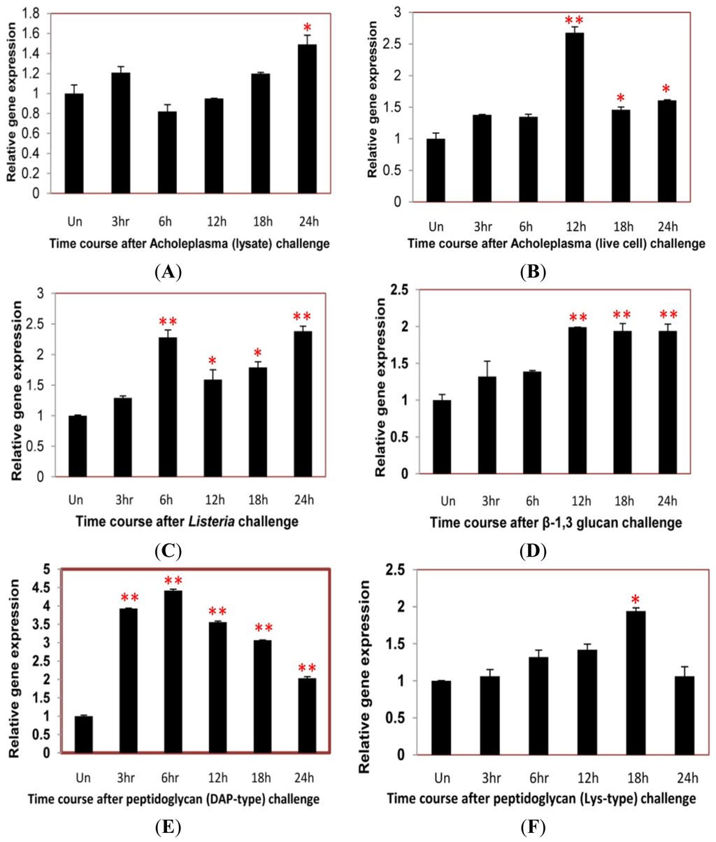After Acholeplasma lysate stimulation, there was no striking upregulation of TmCD63 until about 24 h of challenge (Figure 9A). Similarly, with Acholeplasma live cell injection, the expression level didn’t show a significant change, except after 12 h interval, where the expression levels was maximum (Figure 9B). Challenge with a serious intracellular pathogen, such as L. monocytogenes led to a significant upsurge in the expression levels of the gene at 6 h post-stimulation and was maintained till 24 h (Figure 9C). Similar trend was also observed after injection of β-1,3 glucan where the expression was significant at 12 h post-stimulation and maintained until 24 h (Figure 9D). TmCD63 mRNA was significantly upregulated by stimulation with DAP-type PGN, with almost 4–5 fold induction during the first 6 h of infection. The upregulation of TmCD63 transcripts were 2–4 fold at after 6 h post-injection (Figure 9E). A more significant expression of TmCD63 transcript was found at 18 h post-stimulation of Lys-type PGN (Figure 9F).