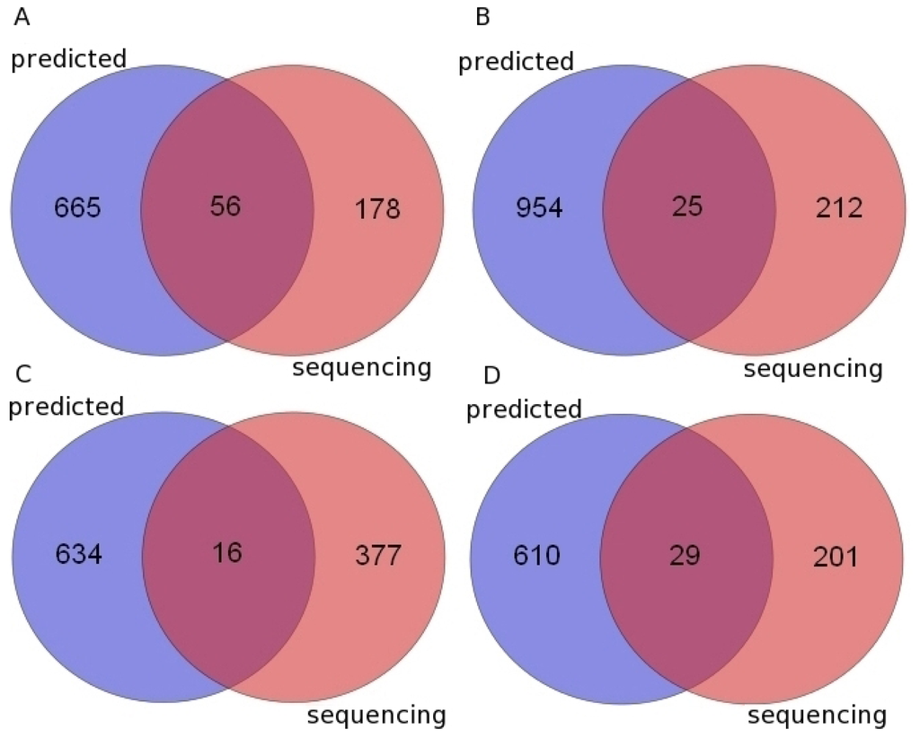 The Venn diagrams of miRNAs identified by using a comparative genomics approach and small RNA sequencing data. (A) Chimpanzee; (B) Gorilla; (C) Orangutan; (D) Rhesus macaque. Predicted: miRNAs which were predicted by using a comparative genomics approach. Sequencing: miRNAs which were identified from small RNA sequencing data.