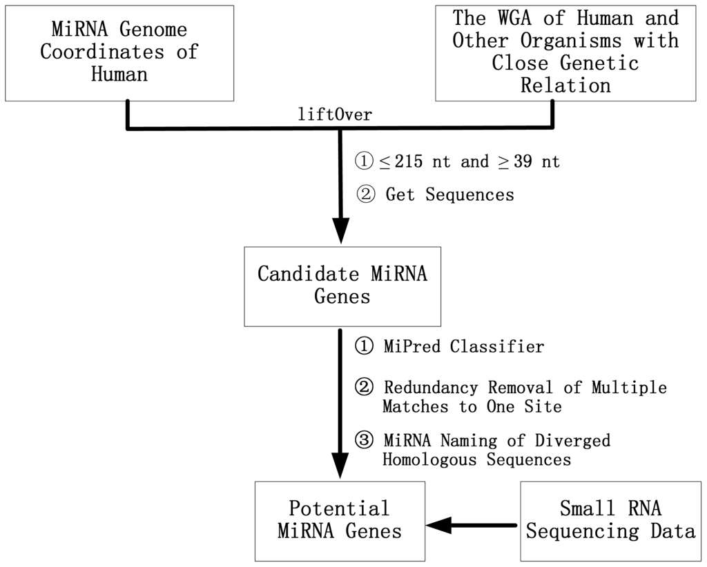Human was selected as the reference organism because, to date, the human miRNAs are the most studied and have the most experimental evidence, and humans are closely related to other primates such as chimpanzee, gorilla, orangutan, rhesus macaque and marmoset. Using a comparative analysis method, the pre-miRNAs of marmoset, chimpanzee, gorilla, orangutan and rhesus macaqu have been investigated. The comparative genomics method in this study is explained as follows (see flow chart Figure 2): first, the LiftOver program [] was used to map the genome coordinates of the human pre-miRNAs to the genomes of other closely related species to obtain the coordinates of the candidate homologous miRNAs on the genomes of the interested organisms; next, if different members of one miRNA family mapped to overlapping loci, then only one miRNA was selected to represent this miRNA family in that organism; after retrieving the sequences using the coordinates of the candidate pre-miRNAs they were classified using the MiPred program [] with the modified threshold value of gene lengths based on the sequence data of animals that are available in miRBase; and the newly identified homologous sequences of the human pre-miRNAs were named according to the miRBase naming criteria []. Finally, The potential pre-miRNAs were annotated and classified into the known miRNA families by program rfam_scan.pl, which is a perl wrapper for searching nucleotide sequences against the Rfam database (v11.0) Wellcome Trust Sanger Institute, Hinxton, Cambridge, UK) [] using the Infernal software (HHMI’s Janelia Farm Research Campus, Ashburn, VA, USA) []. Moreover, our scripts for the identification of orthologous pre-miRNAs are available in Supplementary information 2.