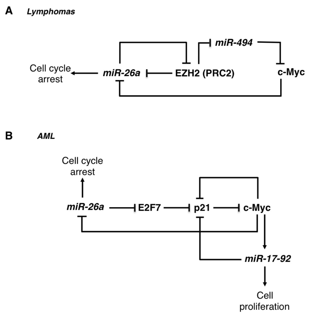 (A) Schematic representation of the regulatory network between miR-26a, c-Myc and EZH2 in lymphomas. Repression of miR-26a by c-Myc induced the expression of its target EZH2, which support c-Myc oncogenic activity by epigenetically silencing genes involved in cellular differentiation and tumour suppression. EZH2 targets include miR-26a and the c-Myc repressor miR-494 (see text for details); (B) Schematic representation of the regulatory network between miR-26a, c-Myc, E2F7 and p21 in AML. Repression of miR-26a by c-Myc induced the expression of its target E2F7, which in turn inhibits the expression of the tumour suppressor p21. p21 suppression is enforced by c-Myc dependent activation of the oncogenic miR-17-92 cluster (see text for details).