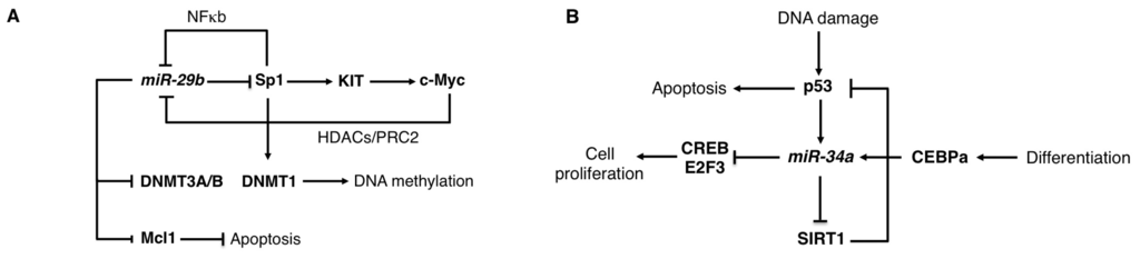 (A) Schematic representation of the regulatory networks mediated by miR-29b in hematological malignancies. miR-29b affects DNA methylation by direct and indirect targeting of DNMT3A/B and DNMT1, respectively. In addition, it represses c-Myc activity through translational repression of Sp1 and stimulates apoptosis by inhibiting Mcl1 (see main text for details); (B) Schematic representation of the regulatory networks mediated by miR-34a in leukemia. During myeloid differentiation CEBPα induces miR-34a, which post-transcriptionally represses the transcriptional regulators E2F3 and CREB. This results in decreased cell proliferation. In addition, miR-34a is a transcriptional target of p53 and sustains its expression through inhibition of SIRT1 (see main text for details).