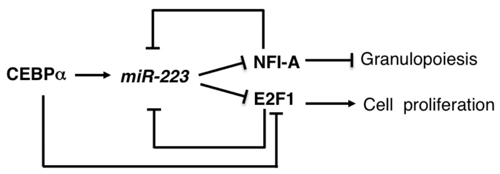 Schematic representation of the regulatory networks mediated by miR-223 in myeloid cells. CEBPα induces miR-223, which post-transcriptionally represses the transcriptional regulators E2F1 and NFI-A during granulopoiesis. This feed-forward loop is connected with feedback loops in which E2F1 and NFI-A inhibits the transcription of miR-223 in undifferentiated myeloid precursors. In addition, CEBPα itself inhibits transcription of the cell-cycle regulator E2F1.